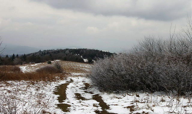 Podejscie z Woli Piotrowej na grzbiet Bukowicy w zimowej scenerii.
