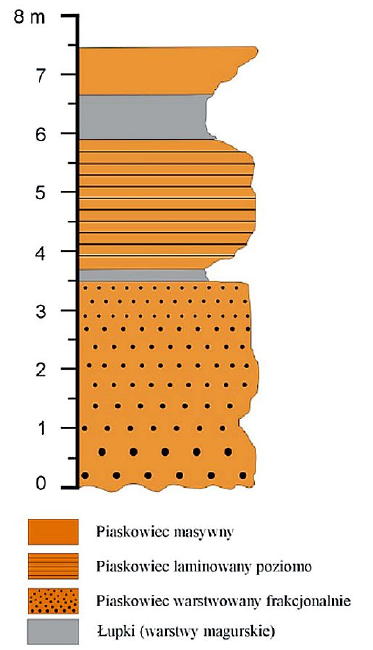 Il. 20 Magurycz Duży. Profil geologiczny warstw magurskich w ścianie eksploatacyjnej kamieniołomu, (reprod. z Welc 2009, s. 63, fig. 6)