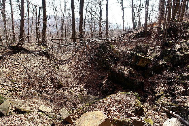 | | Il. 21 Magurycz Duży. Jedno z wyjść z kamieniołomu, przekopane przez przeciwstok, służące do komunikacji z wyrobiskiem i transportu urobku. Widok w kierunku wschodnim, w tle – grzbiet Magury Wątkowskiej, 18 kwietnia 2010 |