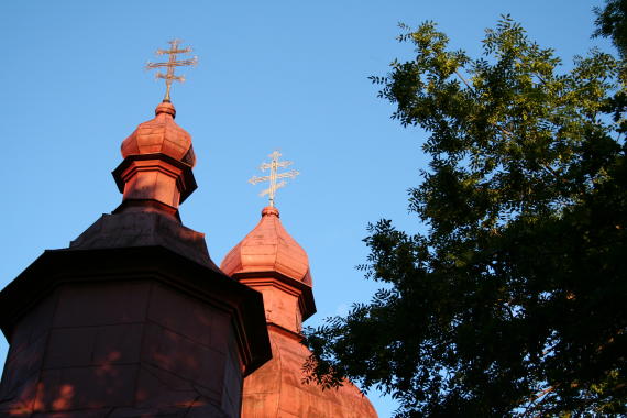 Cerkiew w Krzywej w promieniach zachodzącego słońca