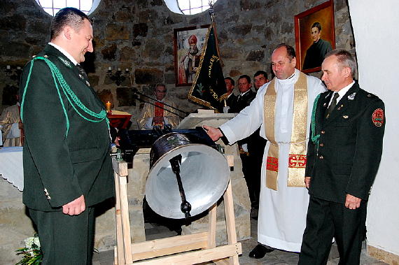 Po raz pierwszy "Św. Hubert" zabrzmiał podczas mszy św. w dniu 9 listopada 2008 r. Od lewej: Wojciech Nowak (fundator dzwonu), ks. Jan Delekta, Stanisław Ząbik- prezes koła łowieckiego ZACISZE.