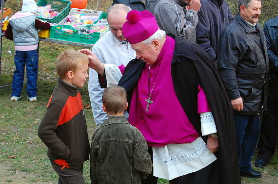 "Ty też możesz zostać w przyszłości biskupem..."- powitanie ks.bpa Kazimierza Górnego z Rzeszowa z młodymi pielgrzymami.
